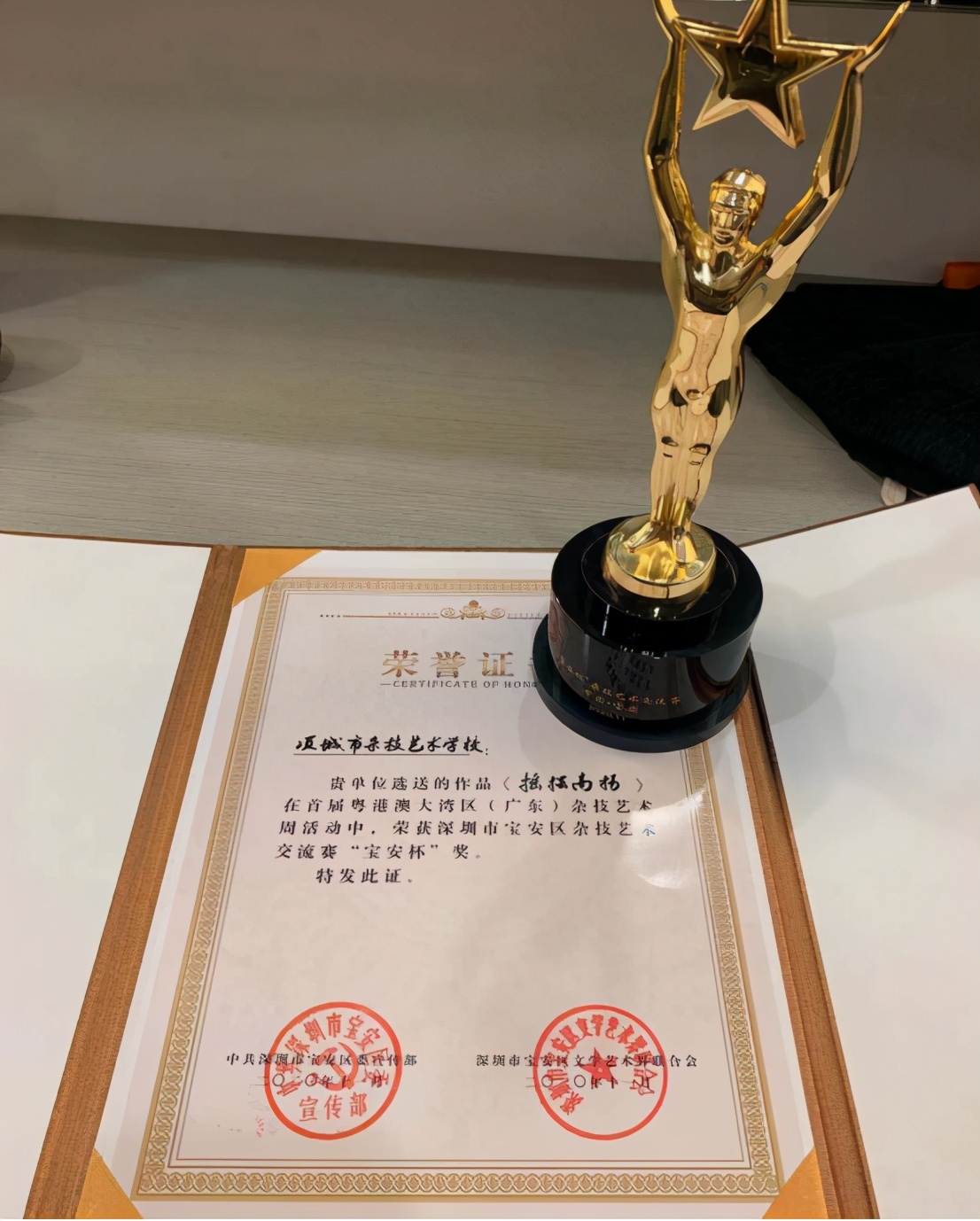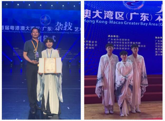 项城市杂技艺术学校演员刘晨晨、杜健康、杜永康出演节目《摇摆高拐》荣获深圳市宝安区杂技艺术交流赛“宝安杯”奖。
